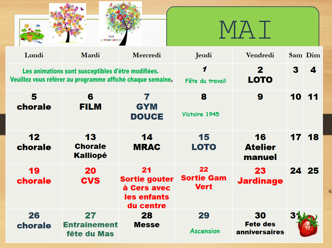 Animations EHPAD Cers – Programme de mai 2025 au Mas du Moulin