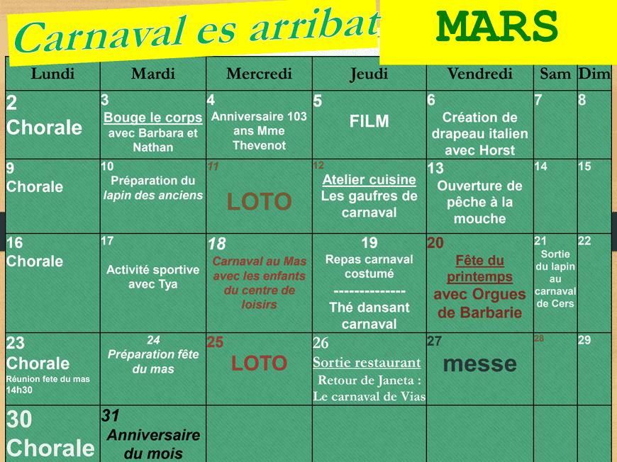 Animations EHPAD Cers – Programme de mars 2026 au Mas du Moulin